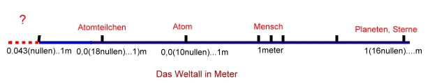 die Physiker an eine Grenze gelangt. Es werden keine kleineren Teilchen mehr gefunden. Sie sagen man stehe vor einer Mauer, der so genannten Plankschen Mauer, gleichbedeutend mit einer Größe von 0,00(43