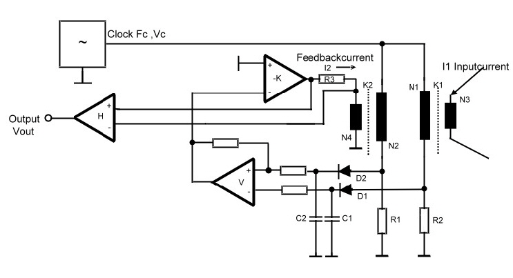 measurement current I1 whereas K2 is controlled by an feedback current having a proportional value of I1.The difference DV of the DC voltage from both dividers is amplified and leaded back to K2. Its obvious,