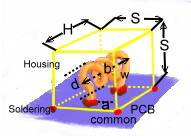 soldered on two soldering eyes surrounded from the ground of the PCB. A rectangular copper sheet housing is soldered