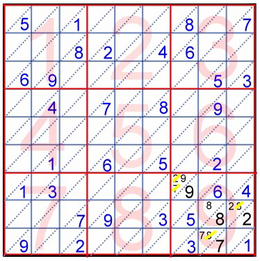 A SZQ - example in Figure 1 is drawn in green. In the solved puzzles, all numbers from 1-9 can be in every row, every column, and every square.These target numbers of the OR - condition is indicated in Figure 1, with small numbers in each field. At the beginning of the puzzle is already in some fields one of this numbers, not in others. In such fields, the small letters numbers no longer apply, of course.The puzzle is solved if there are in each row and each column and in the squares one of the numbers 1-9.Then account for all numbers the small letters. In a real puzzle, these figures are not available, because this fact is well known. But to understand the solution path, it is convenient if these auxiliary digits are available.The calculation goal is not the direct computation of the solution, but we reduce by means of logical comparison the small target figures, until there comes a solution by itself.