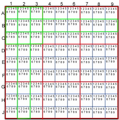 Fig.1 shows the puzzle, it has 9 rows (A-J)  and 9 columns. (1-9) Each row has nine fields, and each column has nine fields, for a total of 81 fields.The 3 rows and 3 columns forming a square, also with 9 fields. Each column, each row, and the corresponding square form a unit SZQ.